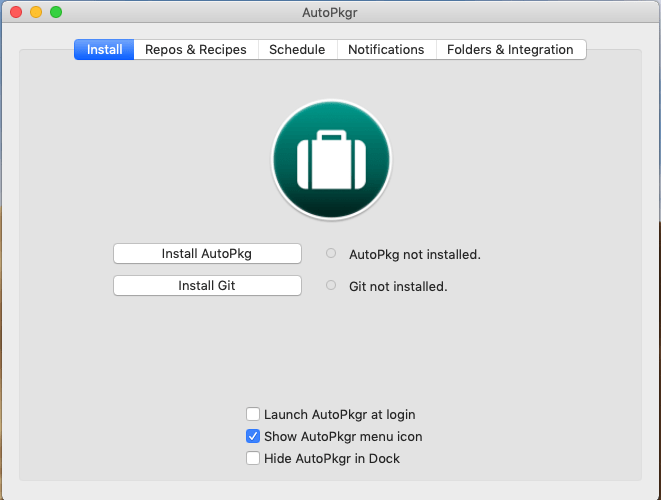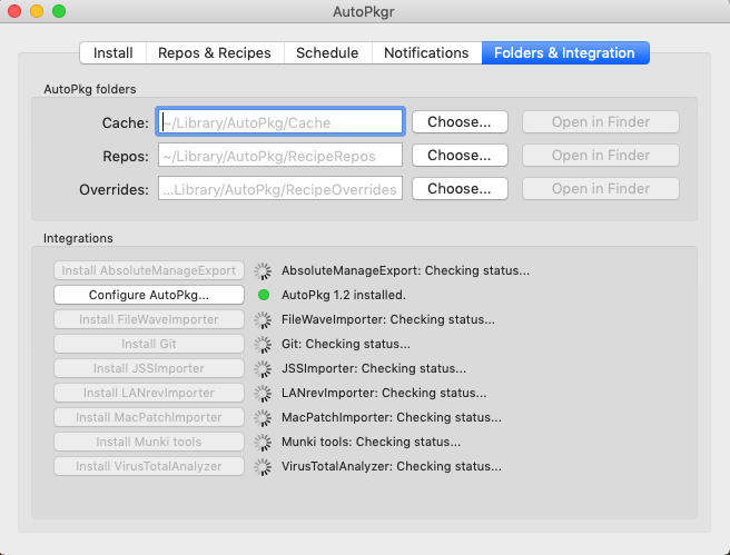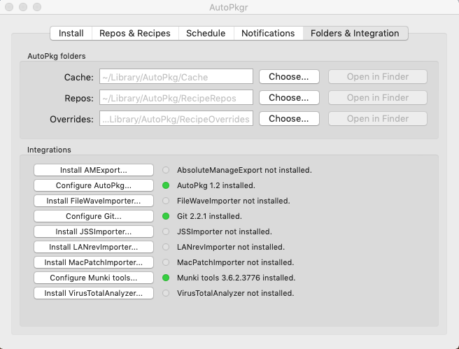 Next step, let’s configure the Folders & Integration tab. At this point, you will see only two green integrations: AutoPkg and Git.