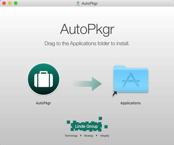 You can follow as a common .dmg application to be installed, dragging and dropping the AutoPkgr into Applications folder, following the screenshot below:
