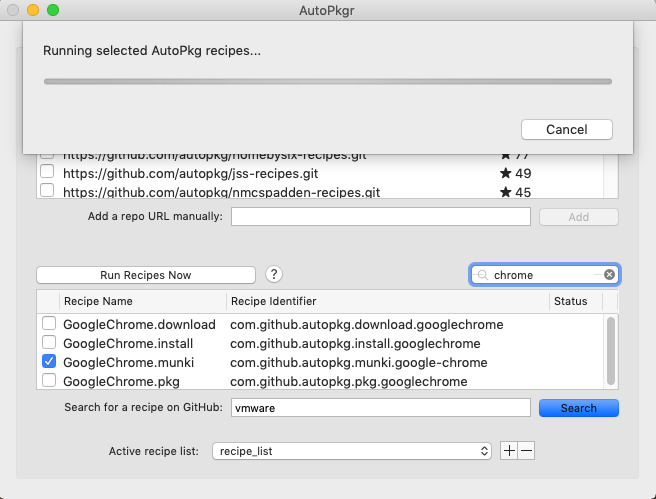 - You can see that’s some recipes showing and one specific is written GoogleChrome.munki. This is the one we’re using. The reason why is simple: we have the pkginfo plist from this recipe.