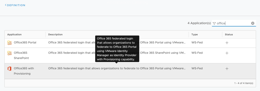 Search for Office365. I’ll use Office 365 with Provisioning to allow user provisioning to the Admin Center side. Select this option.
