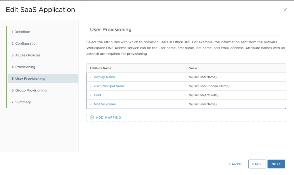 On User Provisioning Step, we need to configure the values to be used during provisioning state.