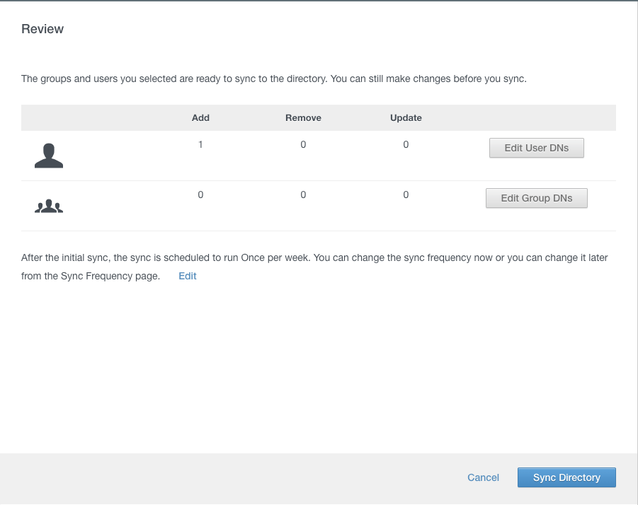 On Review page, just check the amount of users / groups which will be added / removed and click on Sync Directory.