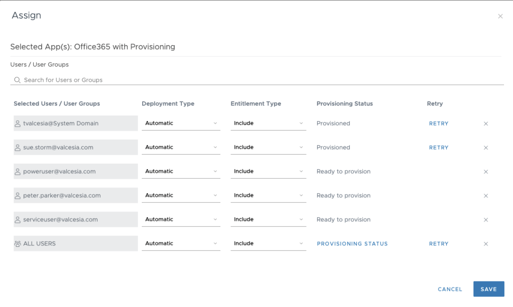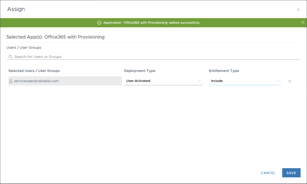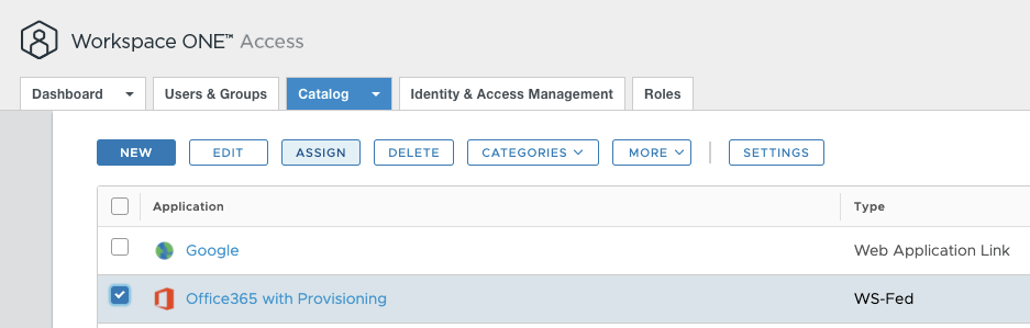 You can see the user’s provisioning status by selecting Catalog tab, select Office 365 with Provisioning and click on Assign.