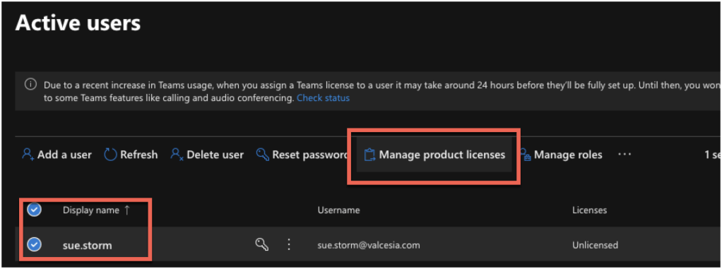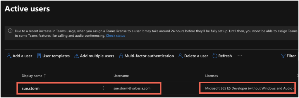 From Microsoft Admin Center side, you will see the user provisioned and only the license that’s it not automatically configured (I did this with intention).