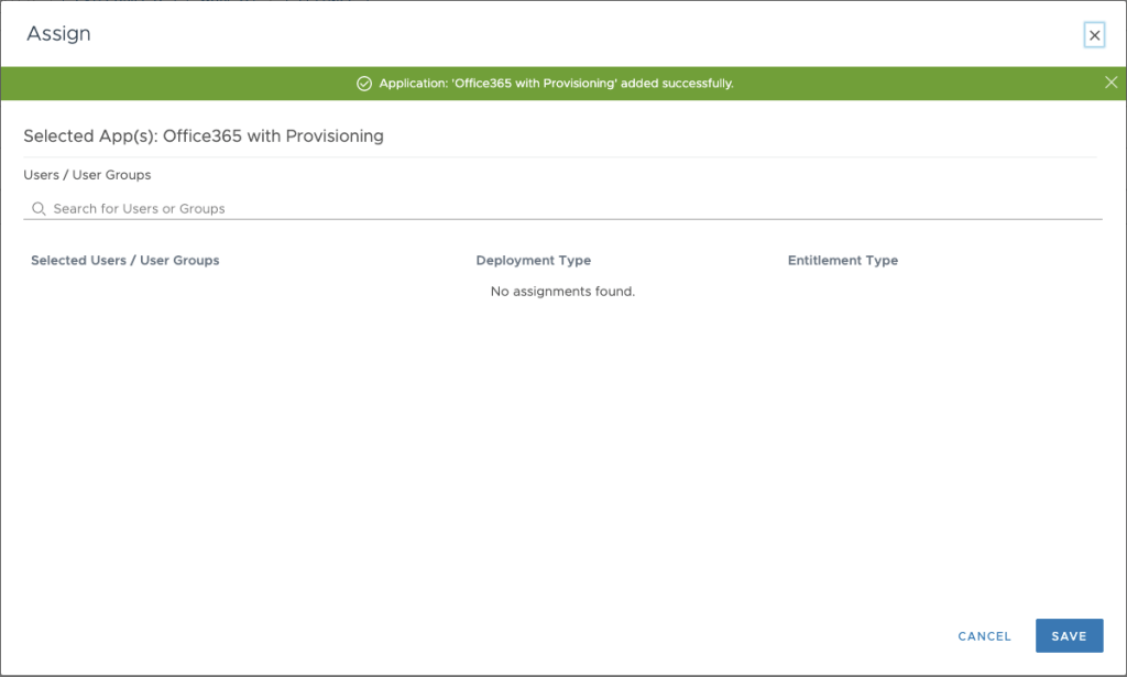 The Assign page will be shown to select users or grupos to give Office 365 with Provisioning access.