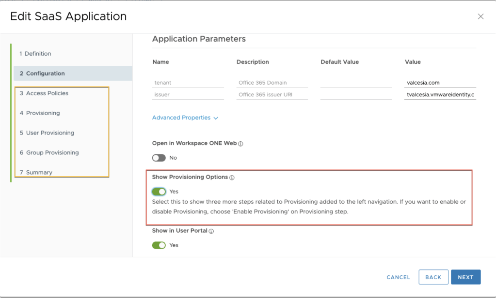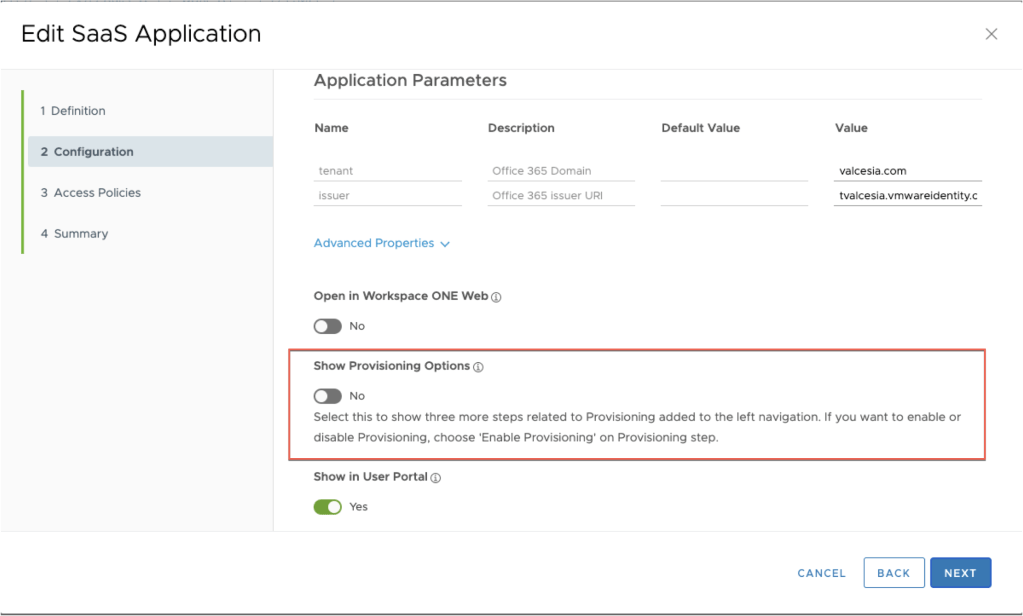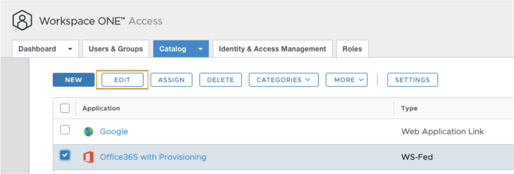 From Workspace One Access side, it’s time to configure Office 365 with provisioning options. Click on Catalog tab and click into Web Apps.