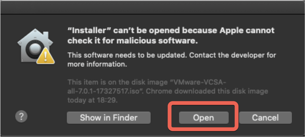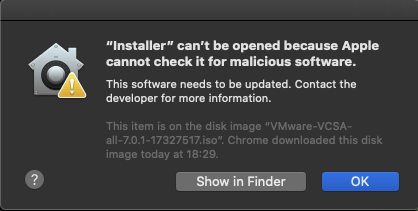 I took the decision to start working on my vCenter to upgrade it the latest version (vCenter 7). As I’m a macOS user, I came across into a problem when trying to open Installer app: