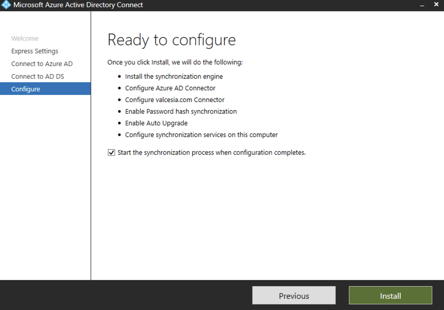 In this blog post I’ll share the setup I did installing Azure AD Connection my lab environment (this is a requirement is your testing Microsoft Office 365 federation along with Microsoft Active Directory Federation Services – ADFS).