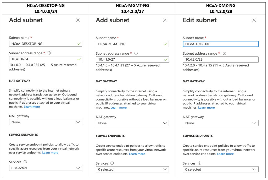 - Create three non-overlapping subnet address ranges in classless interdomain routing (CIDR) format in the VNet